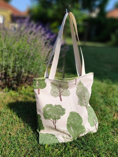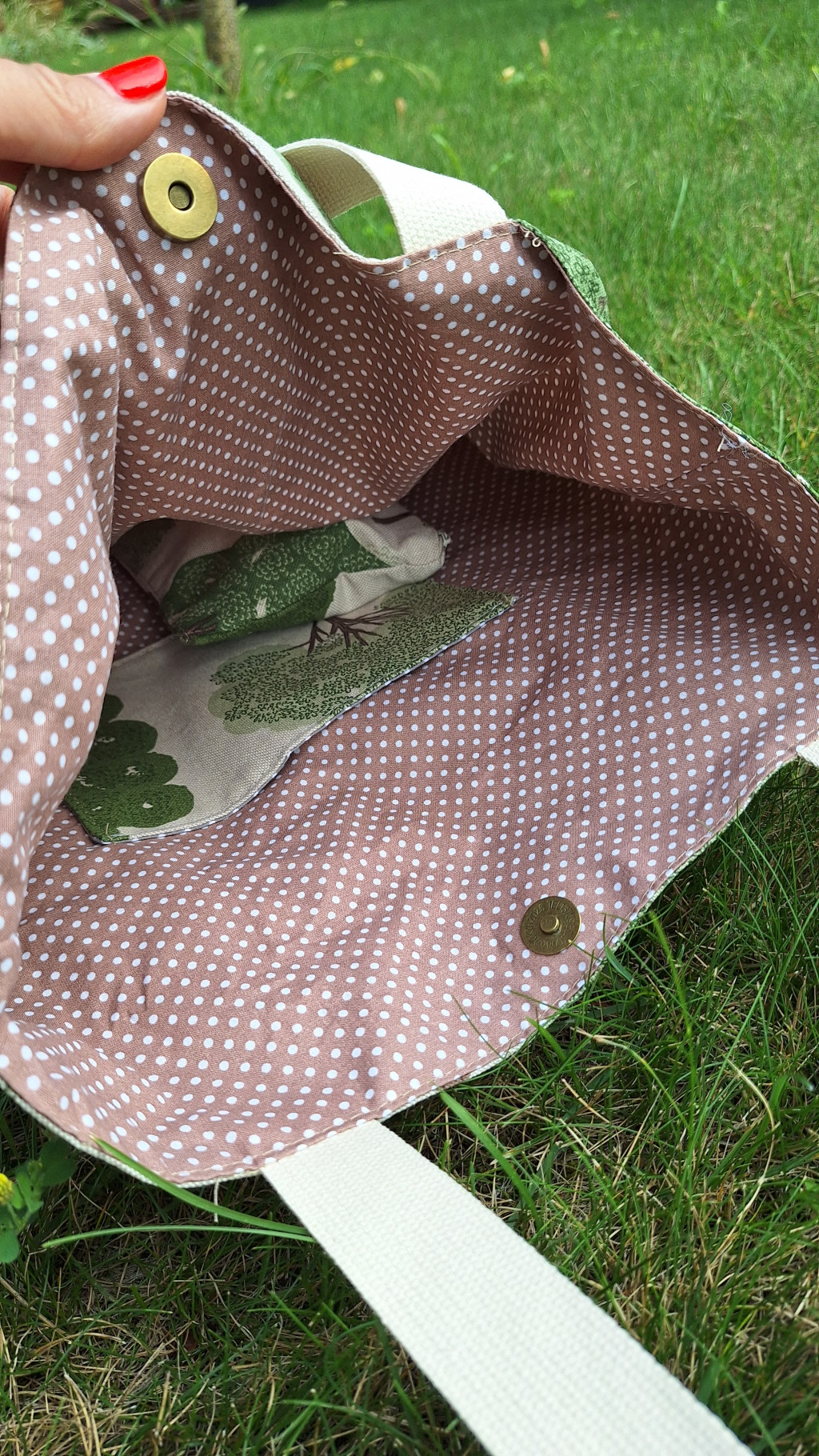 Mágneszárral záródó két rétegű vállon is hordható vászontáska. Kívül mutatós dekorvászon, belül zöld pöttyös pamutvászon. Kényelmes, sok-sok mindent elnyelő táska a mindennapokra. Kulcsnak, telefonnak egy kis belső zsebbel. Mérete: 40x42cm, kb. 66 cm-es füllel.40 C°-on mosható, vasalható.